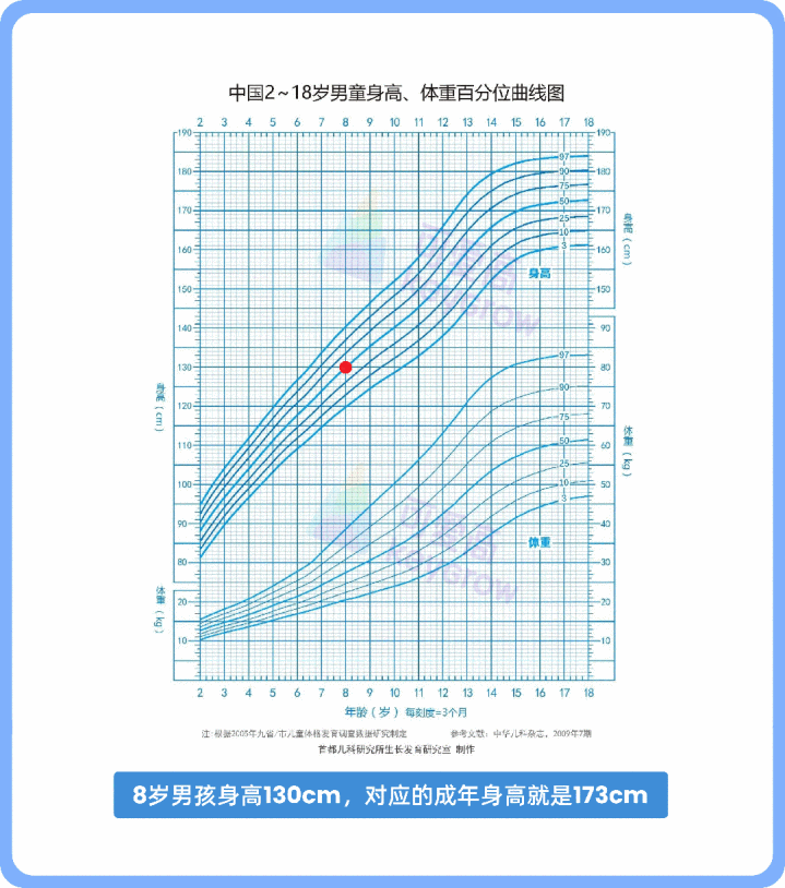 比如下图:8岁男孩身高130cm,位于50百分位,对应的成年身高约是173cm。