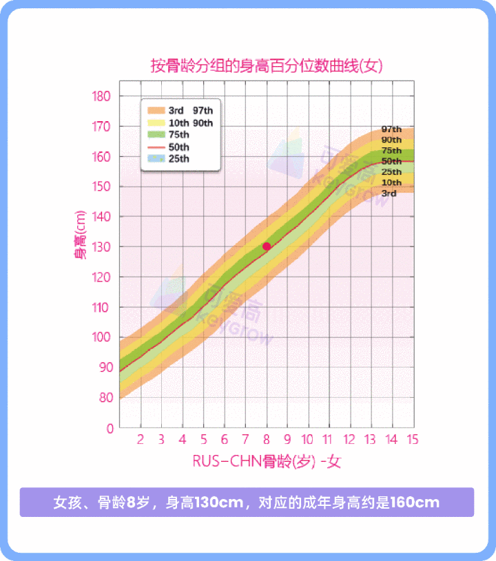 比如下图:8岁女孩身高130cm,对应的成年身高约是160cm。